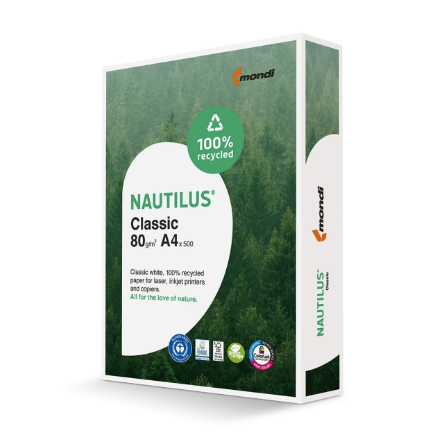 Das ganz besondere Recyclingpapier Nautilus Classic® von Mondi ist ein hochweißes Premium-Recyclingpapier. Es ist aus 100 % Altpapier hergestellt und leistet durch den mehrmaligen Recyclingprozess einen wichtigen ökologischen Beitrag zur Ressourcenschonung. Die für die Produktion von Nautilus® Classic verwendete Energie ist zu 80 % biogen, wodurch der CO2-Ausstoß deutlich verringert wird – er liegt im Schnitt bis zu 75 % unter dem Wert herkömmlicher Recyclingpapiere. Nautilus® Classic besitzt die gleichen Laufeigenschaften wie holzfreies Papier und gliedert sich in die Green Range von Mondi ein. Aufgrund seiner hohen Weiße ist es außerdem kaum von einem solchen zu unterscheiden.