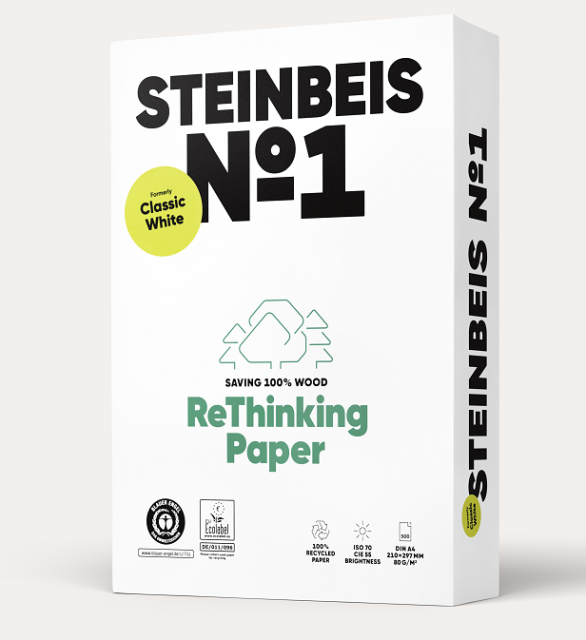 Steinbeis No.1 Classic White ist ein Standard-Recycling-Kopierpapier aus 100% Altpapier mit einer ISO 70 / CIE 55er Weiße. Steinbeis Classic White ist im Portfolio von Steinbeis das Büropapier mit den absolut besten Umweltwerten und damit die Empfehlung für besonders umweltbewusste Verbraucher. Durch problemlose Laufeigenschaften und ordentliche Druckergebnisse eignet es sich für Standardanwendungen wie Laser-, Fax- und lnkjetdruck. Ideal für die interne Kommunikation.