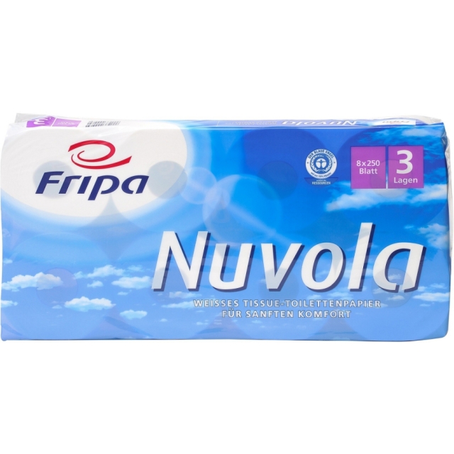 Fripa Nuavola Toilettenpapier 3-lagig RECYCLING weiß mit Blauem Engel 10x12cm 8×8 Rollen á 250 Bl.