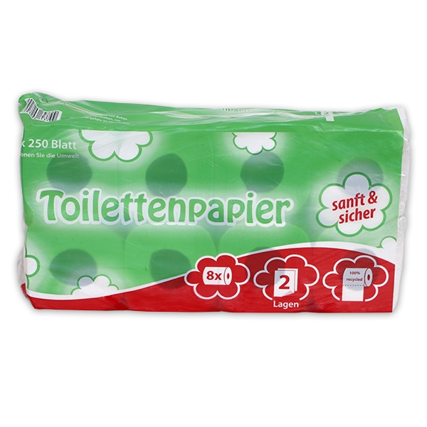 Toilettenpapier HV 2-lagig RECYCLING weiß 9,5x11cm 8×8 Rollen á 250 Bl.