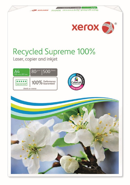 Xerox Recycled Supreme Papier bietet hochweiße Qualität, die in Optik, Zuverlässigkeit und Umweltfreundlichkeit selbst die Erwartungen anspruchsvoller Papieranwendungen erfüllt. Bei einem Altpapieranteil von 100% setzt dieses Papier neue Maßstäbe im Bereich der Umwelt- und Recyclingpapiere. Xerox Recycled Supreme garantiert eine gleichmäßige Oberfläche und sehr gute Druckergebnisse. Mit seinen sehr guten Laufeingeschaften und den exakten Schnittkanten ist Recycled Supreme ideal für Ihre täglichen Anwendugen geeignet. Als CO2-neutrale Qualität weist dieses Papier ein hohes Umweltprofil auf und unterstützt somit den Fokus Ihres Unternehmens auf Nachhaltigkeit.
